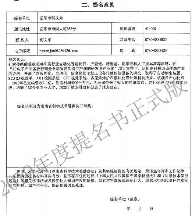 根据湖南省科学技术厅《关于2019年度湖南省科学技术奖提名工作的通知》(湘科计〔2019〕14号)的相关要求,现将我公司参与提名2019年度湖南省科学技术进步奖项目“3C电子产品盖板玻璃全自动智能制造生产线的研发与产业化”的基本情况进行公示,公示时间:2019年5月17日-5月23日。